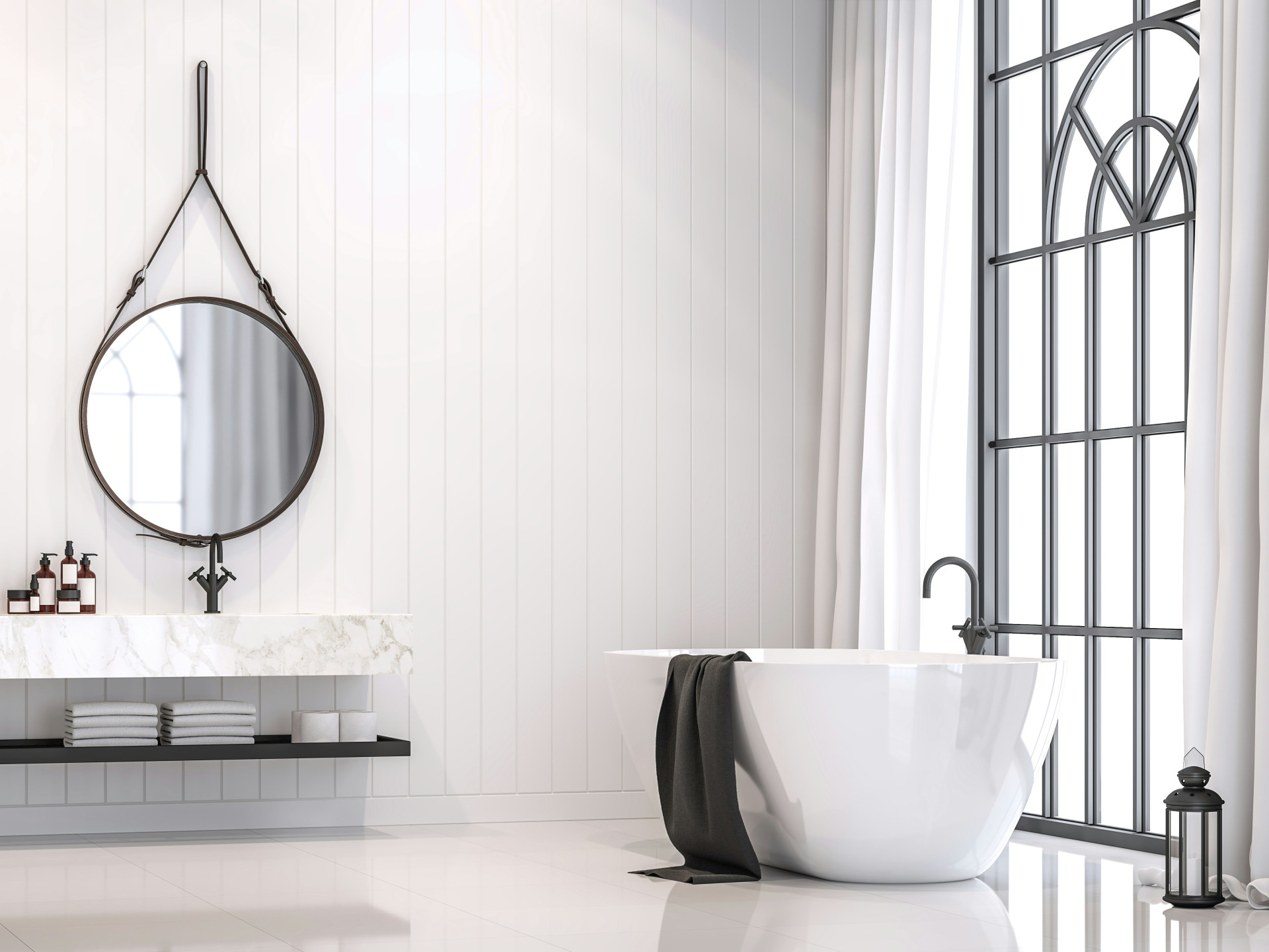 Ein bewährter Tipp: Wählen Sie eine Fläche – etwa den Boden oder die Wand hinter dem Spiegel – als gestalterischen Fokus. So bleibt das Design klar und ausgewogen.